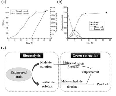 周哲敏教授团队探索了一种具有良好前景的多酶系统构建和应用策略,以及一种低成本、高效率的L-丙氨酸工业化生产工艺。以马来酸酐为原料,溶解于水中形成的马来酸分别在马来酸异构酶、天冬氨酸酶和天冬氨酸β脱羧酶的催化下,转化为L-丙氨酸。通过对关键酶的筛选、重组酶的表达优化和宿主细胞的基因修饰,获得了由宿主细胞基因组酶和两种重组酶组成的三酶系统。同时,开发了L-丙氨酸生产的绿色工艺:由三酶系统催化合成高浓度的L-丙氨酸,用马来酸滴定法沉淀L-丙氨酸,沉降后的上清溶液循环用于下一批全细胞催化。该工艺的成本效益可与目前工业上 L-丙氨酸的生产相媲美,而且产品L-丙氨酸的光学纯度高,非常适合作为药物前体。该研究结果不仅建立了顺丁烯二酸酐生产L-丙氨酸的绿色生产新工艺,而且为多酶级联催化提供了一种兼顾催化能力和细胞生长负荷的有前途的策略。