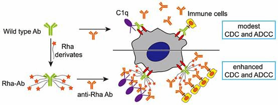 图1. 抗体-鼠李糖偶联物及其免疫活性示意图