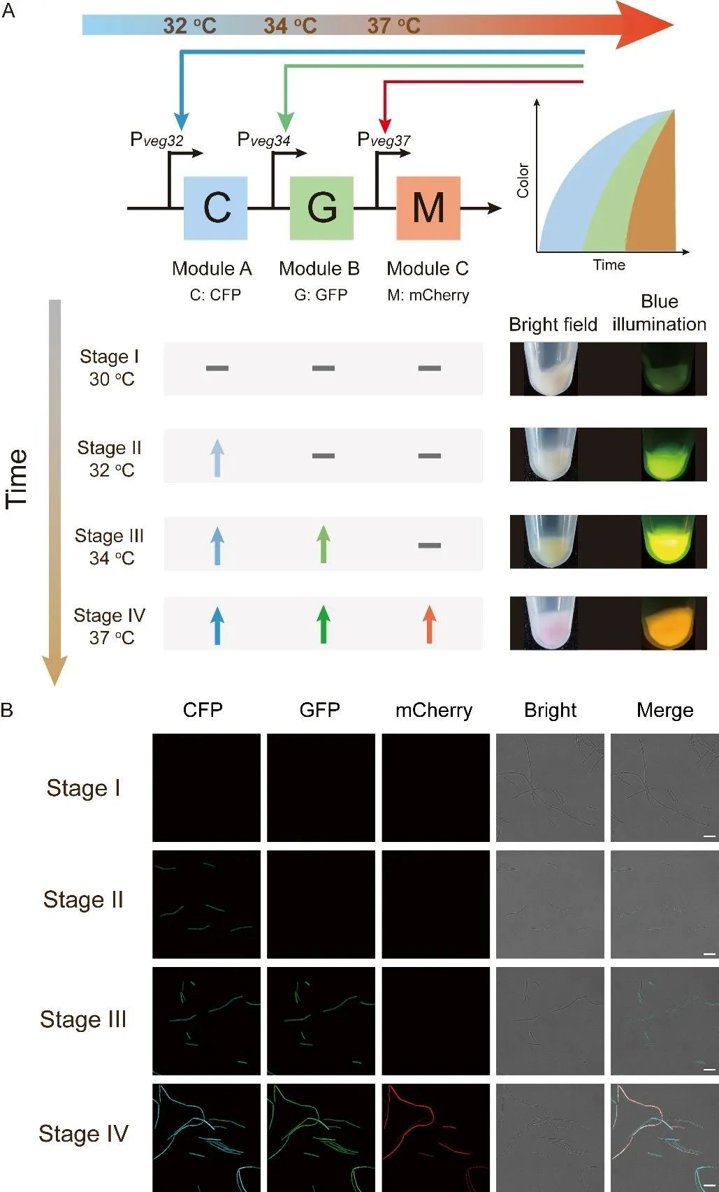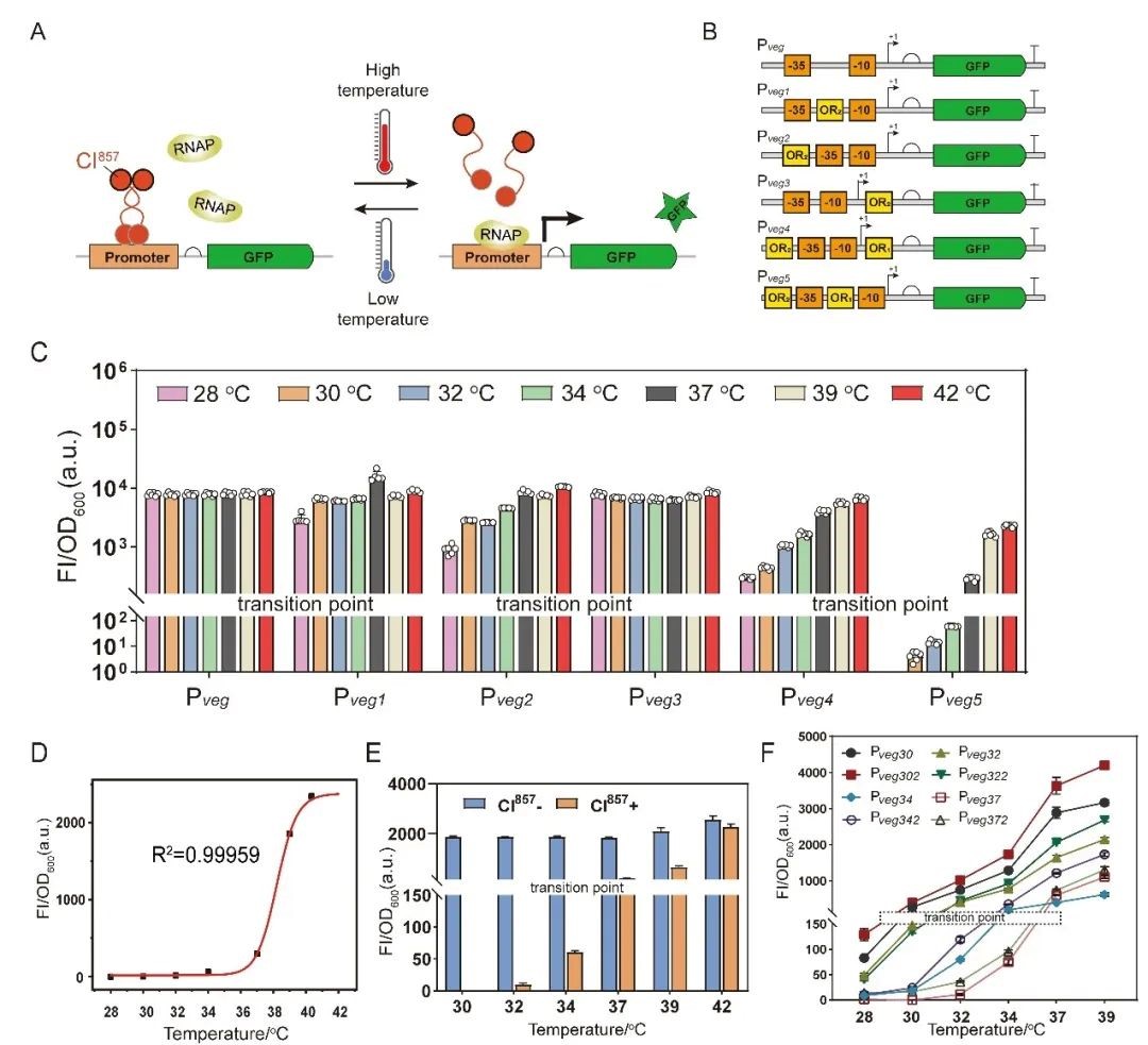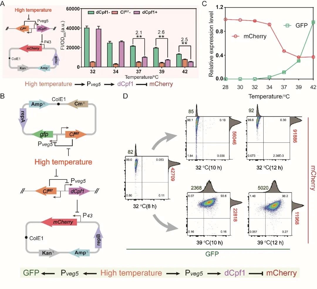 为解决上述难题,该研究在模式工业微生物枯草芽孢杆菌(Bacillus subtilis)中创制了温敏型多模块时序双向调控系统,并将其应用于2'-岩藻糖基乳糖(2'-FL)的代谢网络优化。首先,利用大肠杆菌噬菌体中温敏型转录因子突变体CI857的调控机制,设计并创制了多个不同激活点(30、32、34与37℃)的温敏型生物传感器(图1)。其次,将多个不同激活点的温敏型生物传感器进行联用,构建了一种可以对多代谢模块进行时序激活调控的单输入多输出(SIMO)基因回路,并对该基因回路的正交性与功能性进行了验证(图2)。随后,将温敏型生物传感器与基于CRISPRi的逻辑“非”门进行耦合,构建了一种可以对不同代谢模块进行激活与抑制的双功能基因回路,并对该基因回路进行了功能验证(图3)。