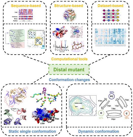 文章首先通过分析突变景观从而全面评估每个位点对酶多种功能的影响,有效地防止仅报告阳性突变,而忽略由突变体引起的负面影响,阐述了远端位点在提高蛋白质表达、活性、热稳定性和立体选择性等功能特性的潜力。其次,通过静态与动态分析解析了远端突变通过长程效应调控结构与动力学,由于残基-残基相互作用网络可以将蛋白质结构中的每个残基结合在一起,因此远端突变不仅会引起局部微调,还会通过多米诺效应传递到活性中心乃至整个蛋白质。远端突变引起的二级结构、三级结构、四级结构和静电荷的变化,以及动态催化中的构象分布和构象转变速率的变化,共同改变了蛋白质的活性、底物选择性、稳定性和其他功能。最后,该文还总结了如何在计算方法的指导下有效设计远端突变,涵盖了基于序列、结构和数据集识别功能性远端热点的策略和计算工具。