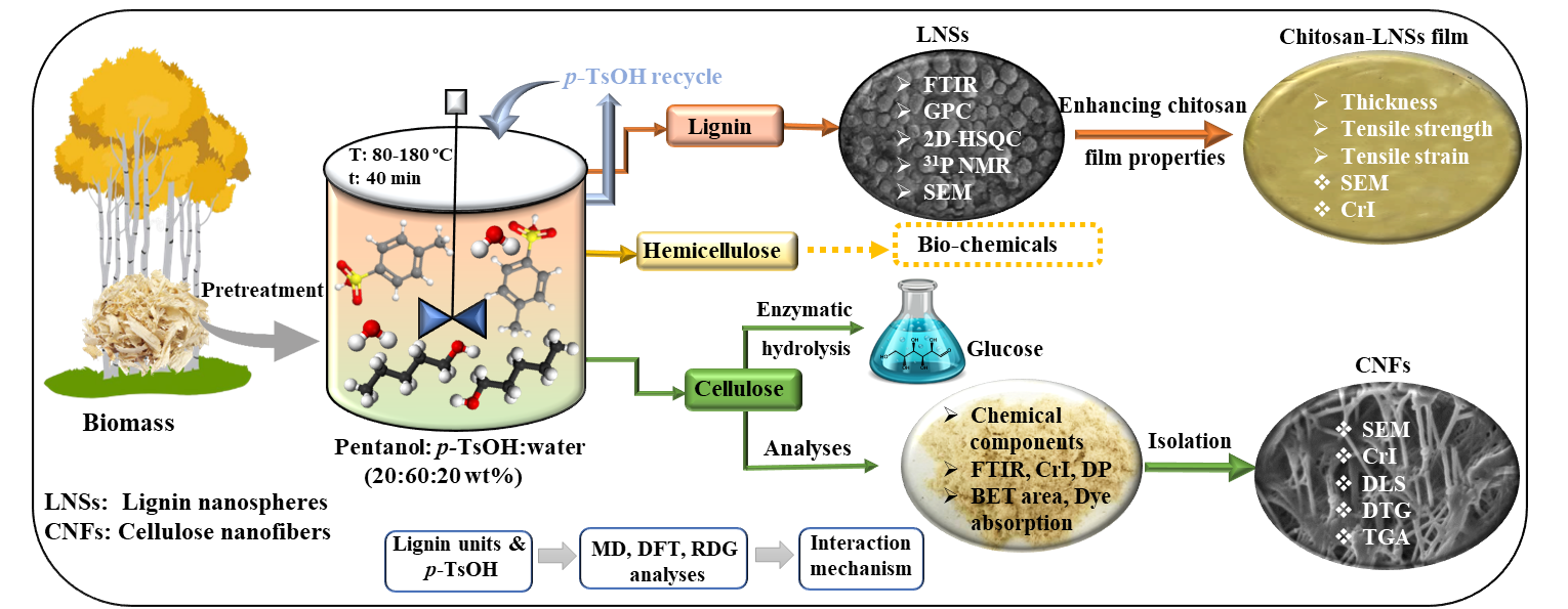针对以上问题,该研究使用戊醇/对甲苯磺酸双相溶剂构建出高效温和的预处理过程,从而简便有效地分离出溶解组分并有效缓解木质素再缩合,分别用来生产纳米纤维素和木质素纳米球,实现了生物质全组分精炼型增值利用。此外,该研究还利用MD和DFT等进行模拟分析,初步从理论上阐明预处理过程中对甲苯磺酸抑制木质素再缩合以及促进木质素纳米球形成的机理。