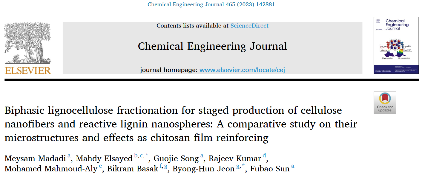 孙付保教授研究团队在利用木质纤维素生物质转化为绿色纳米材料方面取得重要进展,研究成果“Biphasic lignocellulose fractionation for staged production of cellulose nanofibers and reactive lignin nanospheres: A comparative study on their microstructures and effects as chitosan film reinforcing”正式发表于Chemical Engineering Journal (一区, Top, IF=16.7)(//doi.org/10.1016/j.cej.2023.142881)