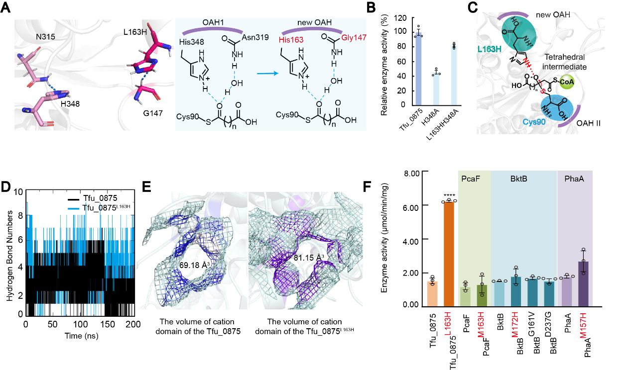 经筛选后发现Tfu_0875阳离子域的突变体L163H酶活提高最显著,比Tfu_0875提高了313%。L163H的咪唑基团比活性中心His348的咪唑基团更接近底物乙酰辅酶A的Cα原子,且Tfu_0875L163H的G147可以与L163H形成氢键,这与Tfu_0875中的活性中心H348和N315 (OAH1)相同。同时测量Tfu_0875H348A和Tfu_0875L163H/H348A的相对酶活性,结果表明Tfu_0875L163H/H348A的相对酶活性比Tfu_0875H348A高1.79倍,因此认为突变体L163H可以发挥与His348相同的作用,作为氢键供体帮助锚定底物。经过分子动力学模拟发现,Tfu_0875L163H产生的氢键数量明显高于Tfu_0875,说明Tfu_0875L163H与底物乙酰辅酶A之间存在更强的相互作用,可以更快锚定底物乙酰辅酶A,间接缩短反应时间。此外,当L163变为H163时,阳离子域的体积从69.18 Å3增大到81.15 Å3