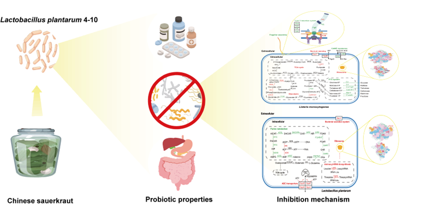 针对上述问题,本研究团队尝试筛选一株具有高抑菌活性且可在短时间内起到杀菌作用的乳酸菌。首先,从发酵泡菜、东北酸菜等传统发酵食品中通过高通量微生物克隆筛选系统Qpix 420分离得到212株乳酸菌,而后通过牛津杯法筛选获得了一株显著拮抗单增李斯特菌的植物乳杆菌4-10。抑菌谱结果显示,该菌株具有广谱抑菌性,可抑制多种革兰氏阳性菌、革兰氏阴性菌和部分真菌,表明其作为天然抗菌剂具有潜在的研究和应用前景。可耐受肠、胃液的环境,对氯霉素、强力霉素、红霉素和四环素敏感,不能诱导抗性决定簇转移,具有一定的安全性,同时还表现出较好的疏水性和自聚集、共聚集能力。这些结果表明该菌株具有较好的益生特性,可在肠道内聚集,发挥其益生功能。通过转录组学分析进一步明晰了植物乳杆菌4-10对单增李斯特菌的抑菌机制,植物乳杆菌4-10可通过产生细菌素来抑制单增李斯特菌膜运输相关基因crr、agrB和dltC的表达,从而破坏细胞膜完整性和限制生物膜形成。PI染色、透射电镜和杀菌动力学曲线的结果证明,植物乳杆菌4-10可在短时间内达到破坏细胞结构的作用,而结晶紫染色和膜内菌代谢活力测定则表明共培养过程中单增李斯特菌的生物膜形成和代谢活动受到抑制。同时通过对无菌发酵上清进行酸碱中和、蛋白酶处理和过氧化氢酶处理,确定主要的抑菌活性物质为细菌素。该研究为了解益生菌抗菌特性、进一步认识益生菌抗菌作用机制、开展新型益生菌产品的研究提供一定的理论依据和实际应用价值。
