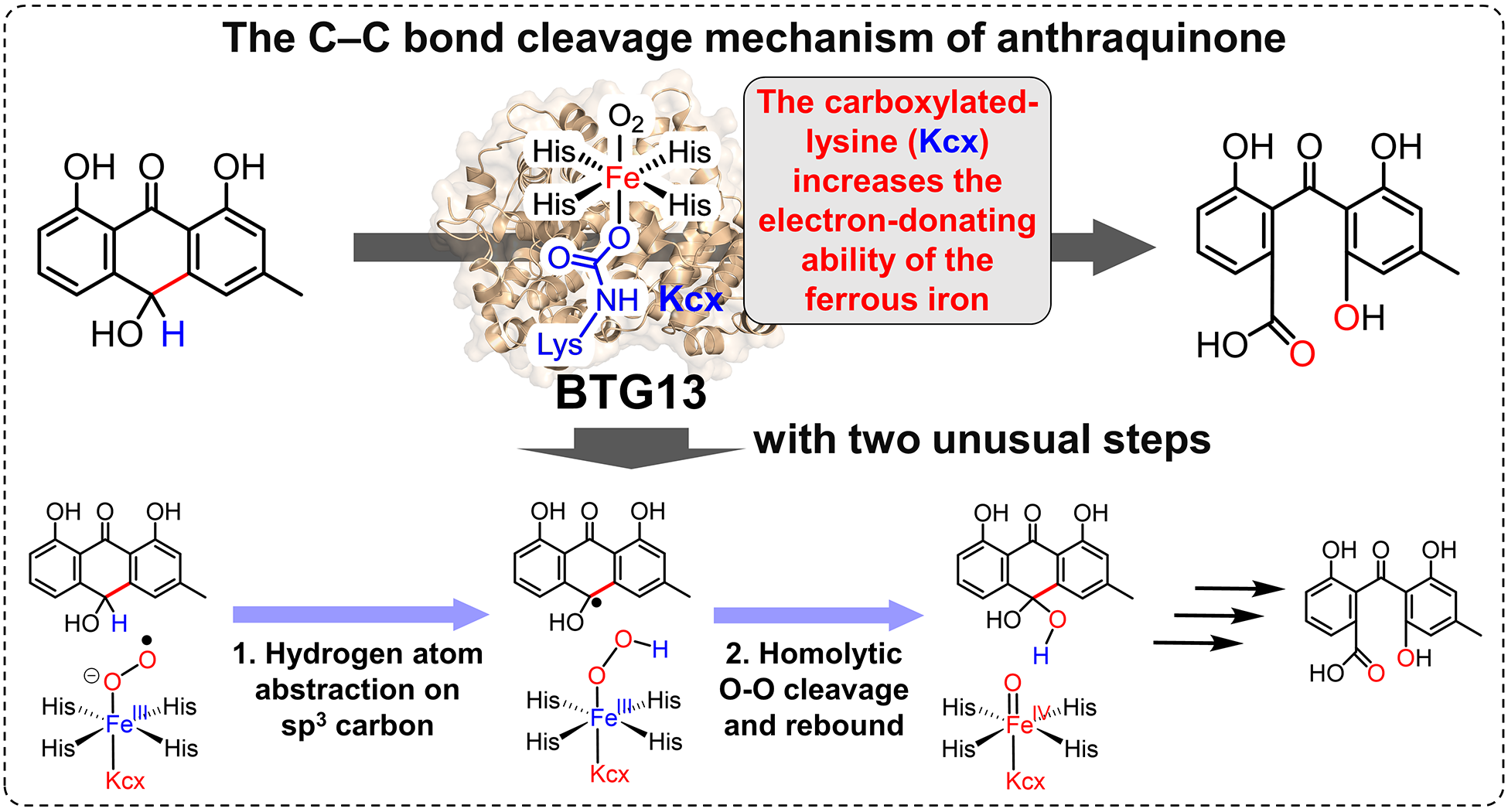 氧杂蒽酮类化合物是一类广泛存在于细菌,放线菌,真菌和植物体中的具有抗微生物,抗肿瘤,抗炎症,抗氧化等生物活性的天然产物。然而,氧杂蒽酮类天然产物在生物合成过程中蒽醌C4a-C10键酶促断裂的机理尚不清晰。在前期研究中,江南大学饶义剑教授团队报道了一种能够催化蒽醌C4a-C10键断裂的非典型非血红素铁依赖的双加氧酶BTG13(Angew. Chem. Int. Ed. 2022, 61, e202208772.)。晶体结构显示,BTG13具有罕见的四个组氨酸残基和一个羧化赖氨酸残基(Kcx)与亚铁离子形成的配位中心。由于该配位模式此前未被报导研究,因而Kcx在催化过程中的功能仍是未知,BTG13催化反应机理仍存在诸多疑团。