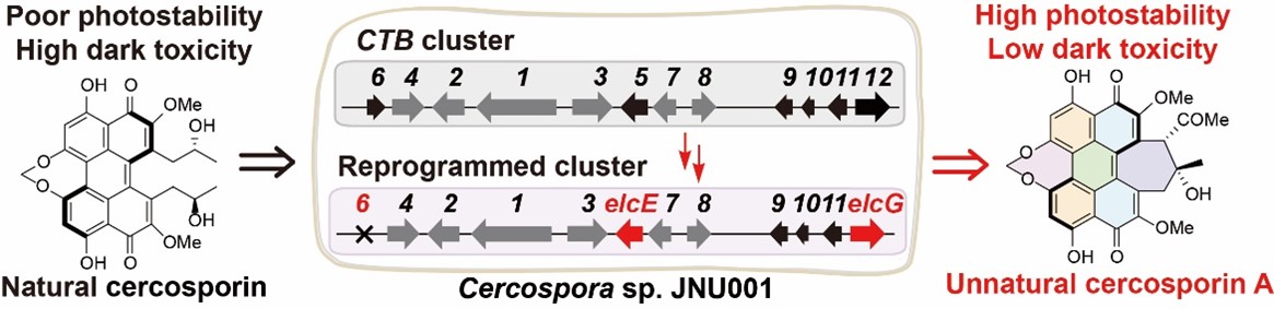 苝醌化合物被认为是光动力疗法中理想的光敏剂之一。然而,天然的苝醌化合物具有光稳定性差、暗毒性高以及无选择性的缺点。为了发掘具有优异特性的苝醌化合物,江南大学饶义剑团队基于B类苝醌化合物的分支代谢途径,采用合成生物学策略对尾孢菌素的生物合成途径进行重编程,实现了一系列具有不同构型和取代基苝醌衍生物的生物合成。其中,非天然苝醌化合物尾孢菌甲素(cercosporin A)不仅具有较高的光稳定性和极低的暗毒性,并且保留了良好的光动力抑菌和抗癌活性。此外,研究发现尾孢菌甲素可以选择性地在细胞中富集,为苝醌化合物的药物开发提供了潜在的靶点,并拓宽了从自然界中发现药物的渠道。