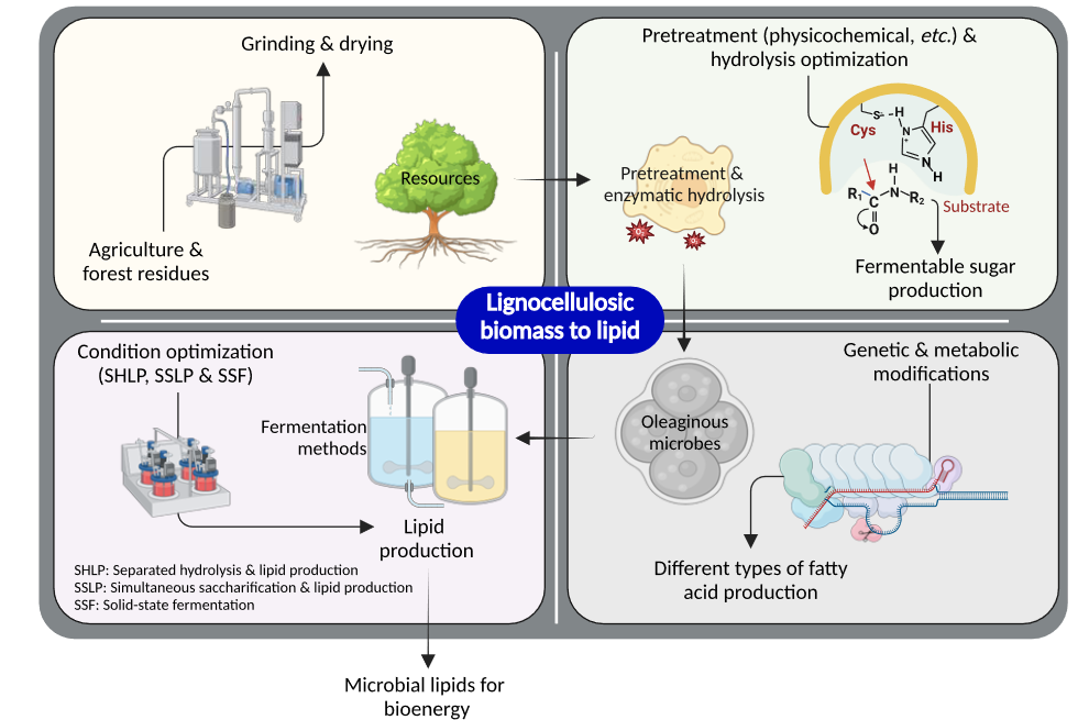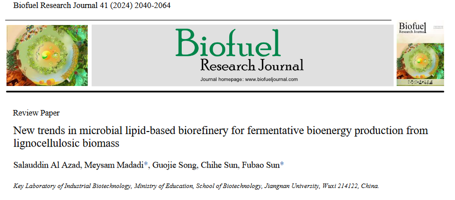 生物资源与生物炼制研究团队对木质纤维素生物质糖发酵微生物油脂的研究进展进行了系统综述,以“New trends in microbial lipid-based biorefinery for fermentative bioenergy production from lignocellulosic biomass”为题正式发表于Biofuel Research Journal, 2024, 11: 2040-2064 (Q1, IF 12.99)