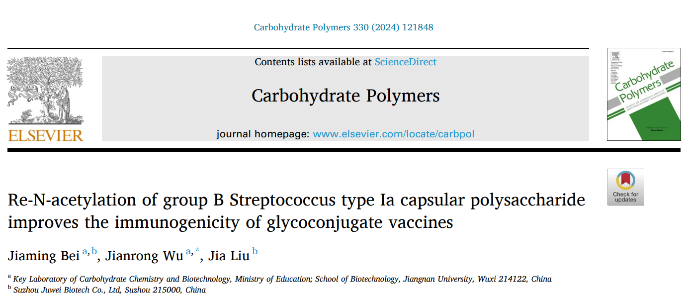 高敏杰团队吴剑荣老师在Ia型B族链球菌荚膜多糖的结构与功能方面研究取得重要进展,研究成果“Re-N-acetylation of group B Streptococcus type Ia capsular polysaccharide improves the immunogenicity of glycoconjugate vaccines”正式发表于Carbohydrate Polymers (IF = 11.2) (//doi.org/10.1016/j.carbpol.2024.121848)。