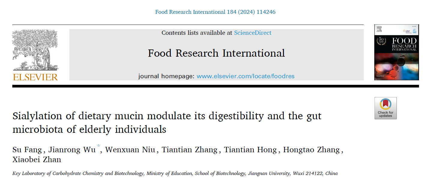 高敏杰团队吴剑荣老师在不同构型唾液酸影响老人肠道菌群群落组成和结构方面研究取得重要进展,研究成果“Sialylation of dietary mucin modulate its digestibility and the gut microbiota of elderly individuals”正式发表于Food Research International (Q1, IF=8.1) (//doi.org/10.1016/j.foodres.2024.114246)。