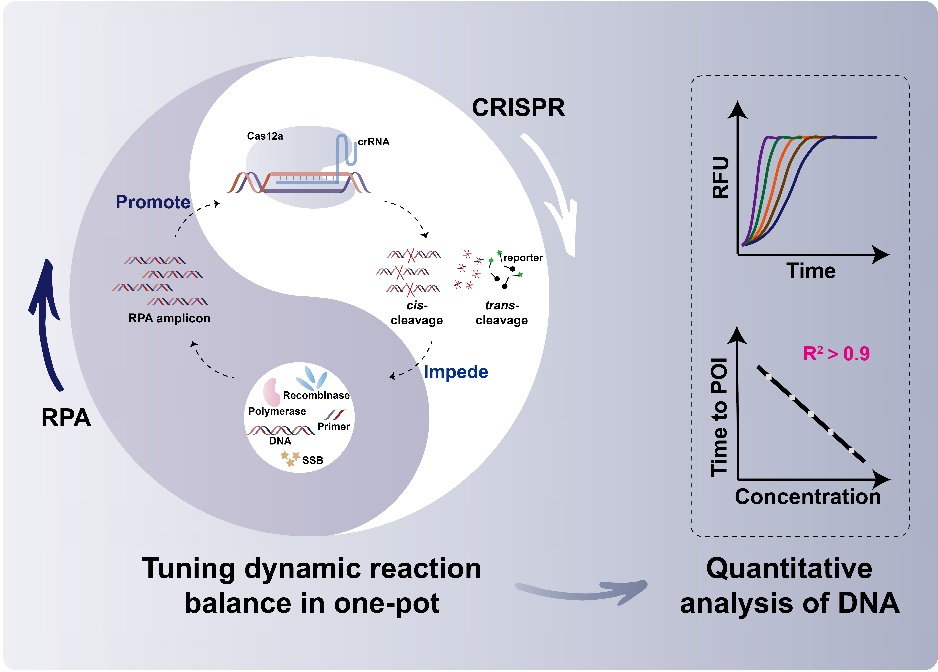 近年来,CRISPR/Cas系统已成为一个突出的多功能核酸诊断工具,但面临着检测灵敏度较低的问题。尽管结合预扩增反应的CRISPR/Cas检测方法能够提高灵敏度,但两步反应操作复杂,存在交叉污染风险。因此,吴群教授等人提出利用一锅CRISPR/Cas12a-RPA系统对微生物进行精准定量的策略,基于RPA扩增与CRISPR/Cas12a切割的多系统动态反应平衡控制,建立了一种新型的微生物定量检测技术,命名为OICRQ。该技术操作简便(仅需37℃反应),效率高(检测时间小于1小时)、灵敏度高(最低10 copies/反应)、分辨率高(实现种水平的定量)、准确性高(P>0.05)、普适性强(可用于细菌、真菌、病毒等各种微生物的定量)。例如,该技术可用于食品发酵体系耐酸乳杆菌(Lactobacillus acetotolerans)的定量(定量范围:10~107copies/reaction),也可用于SARS-CoV-2的定量(定量范围:1.38 × 102至1.38 × 107 copies/reaction),可实现多个真实样品中的靶标微生物(包括发酵食品样品中L. acetotolerans及临床样品中SARS-CoV-2)的精准定量分析。该技术不依赖于复杂的热循环仪器的要求,可作为qPCR的竞争替代技术。本研究为新型微生物精准定量技术打开了一扇新的大门,在医疗诊断、食品生产以及环境体系中精准定量检测细菌、真菌和病毒具有巨大潜力。