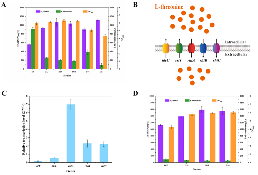 图2 基于关键基因表达和转运体工程提升2,5-DMP的合成水平