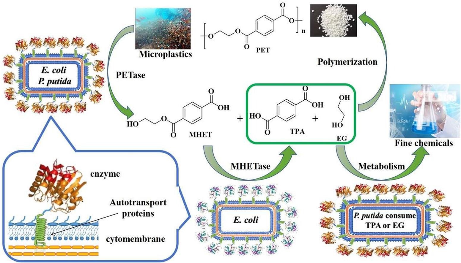 聚对苯二甲酸乙二醇酯(PET)是一种重要的热塑性塑料,具有良好的机械性能、生产方便、无毒、无味、高耐气、耐水、耐油、耐酸碱、透明度高、成本低等优点。由于这些优点,PET被广泛应用于日常生活和生产领域。然而,制备用于降解PET的游离酶的成本很高,因此无法用于工业应用使用微生物进行降解在塑料回收方面具有巨大潜力,由于PET几乎无法穿过细胞膜到达细胞内空间,因此酶分泌成为一个值得注意的研究领域。