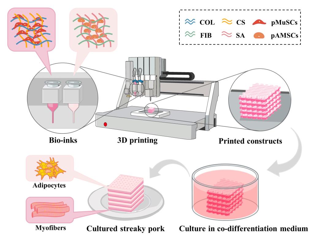 陈坚院士团队针对此问题,江南大学食品合成生物学与生物制造团队研究人员以猪肌肉干细胞(pMuSCs)和猪间充质干细胞(pAMSCs)为研究对象,基于可食用生物材料构筑了适用于两种细胞的双网络水凝胶并将其与细胞组装成生物墨水,创新性地开发了3D 共打印和共分化技术制备出兼具肌肉和脂肪组织的细胞培养五花肉。在之前的工作中,研究人员已经确定了一种有效支持pMuSCs三维增殖和分化的胶原蛋白-壳聚糖复合水凝胶(COL-CS),在本研究中,通过评估pAMSCs在不同水凝胶中的黏附、增殖和分化效率,确定了由纤维蛋白原和海藻酸钠组成的复合水凝胶(FIB-SA)具有最佳效果。随后,用上述2种水凝胶分别包裹pMuSCs和pAMSCs制成生物墨水,通过优化细胞负载量、打印压力和速度,获得了2种生物墨水的最佳打印参数。进一步,研究人员开发了一种共分化策略,实现了pMuSCs分化形成肌纤维和pAMSCs分化形成脂肪的同时诱导。使用该策略,pMuSCs的肌管生成效率与传统方法相当,pAMSCs的脂滴生成面积比传统方法提高了155.5%。最后,研究人员通过两种生物墨水的交错打印构建了五花肉的三维结构,并使用共分化策略诱导肌管和脂肪细胞的同时生成,最终制造出包含肌肉和脂肪组织的细胞培养五花肉。进一步的质构和营养评估表明,细胞培养五花肉具备肉类产品的烹饪特性和食用品质。这项工作为更加灵活、精准、仿生制造含多种组分的细胞培养肉类产品提供了创新策略和技术参考。