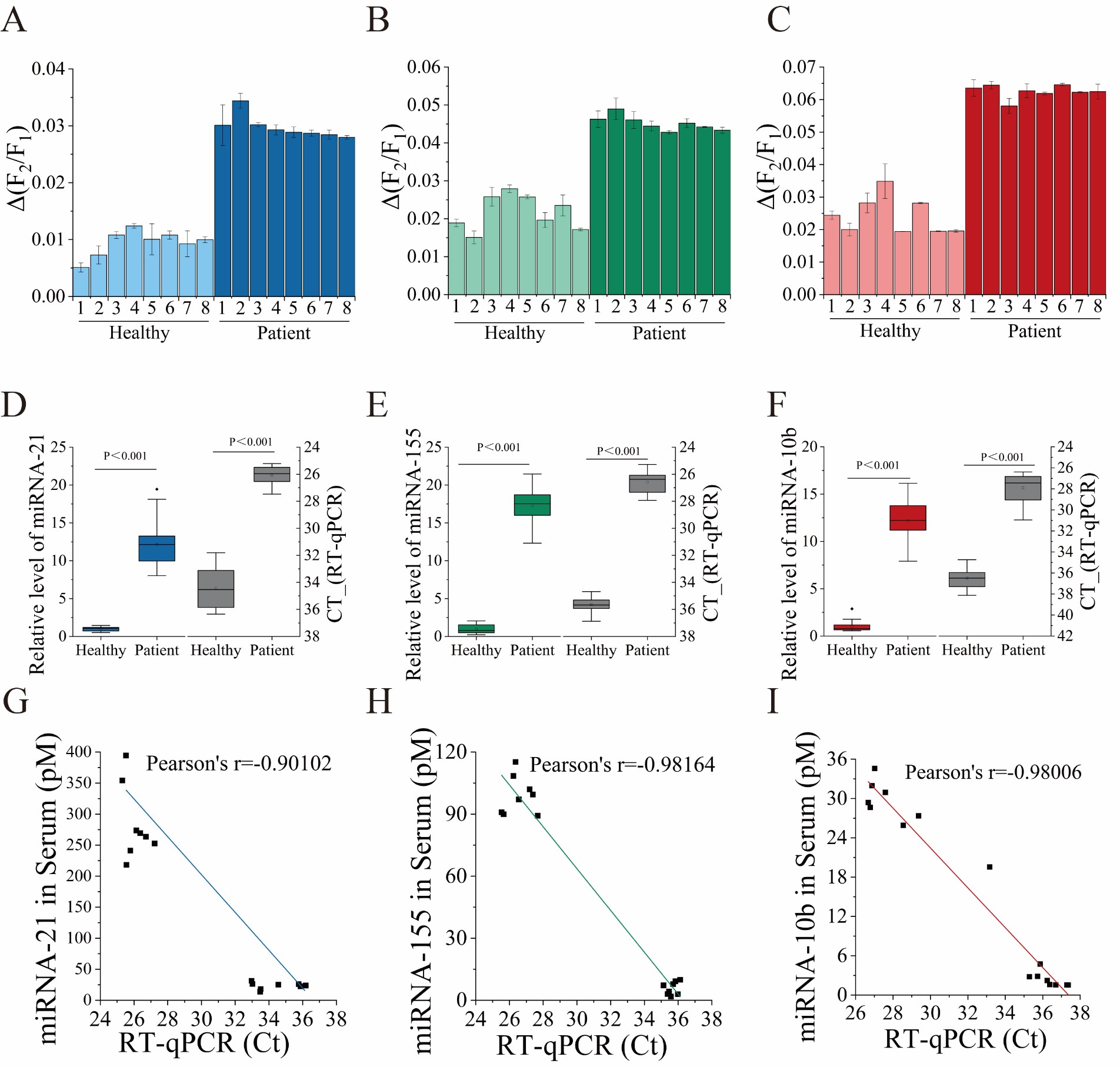 图2 临床血清样本的MiRNA分析。在乳腺癌患者(n = 8)和健康个体(n = 8)的血清样本中测定的(A) miRNA-21、(B) miRNA-155和(C) miRNA-10b的FRET比率。Δ(F2/F1)表示样品中测量的FRET比率与空白对照之间的差异。误差条表示从3个不同的平行测量中获得的结果(n = 3)。通过血清检测和RT-qPCR检测乳腺癌患者(n = 8)和健康个体(n = 8)中(D) miRNA-21、(E) miRNA-155和(F) miRNA-10b的相对表达水平。(G) miRNA-21 (Pearson’s r = -0.90102, P < 0.001)、(H) miRNA-155 (Pearson’s r = -0.98164, P < 0.001)、(I) miRNA-10b (Pearson’s r = -0.98006, P < 0.001)在血清和提取物中相对表达值的相关性。图G- I的统计显著性采用双尾Student 's t-test。