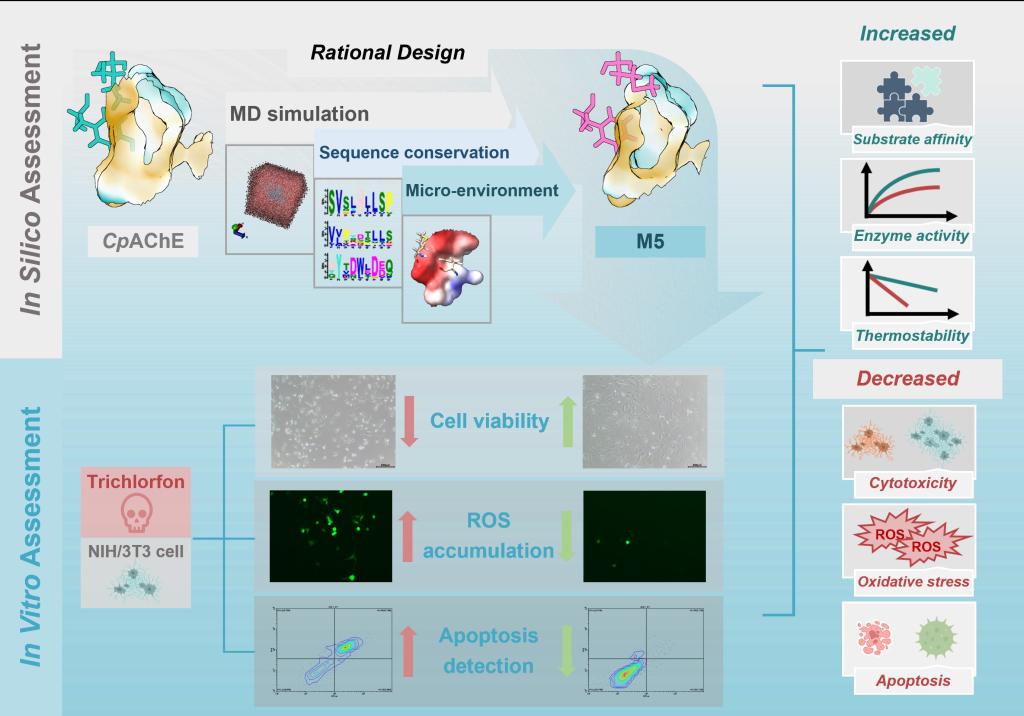 本研究将计算机辅助酶设计与酶替代疗法相结合,展示了通过重塑底物结合口袋的AChE突变体M5在保持热稳定性、增强催化活性和减轻TCF诱导细胞毒性方面的潜力。结果表明,M5可作为一种有效的有机磷农药暴露酶基解毒剂,为减轻此类化合物对非目标生物的不利影响提供了有效策略。