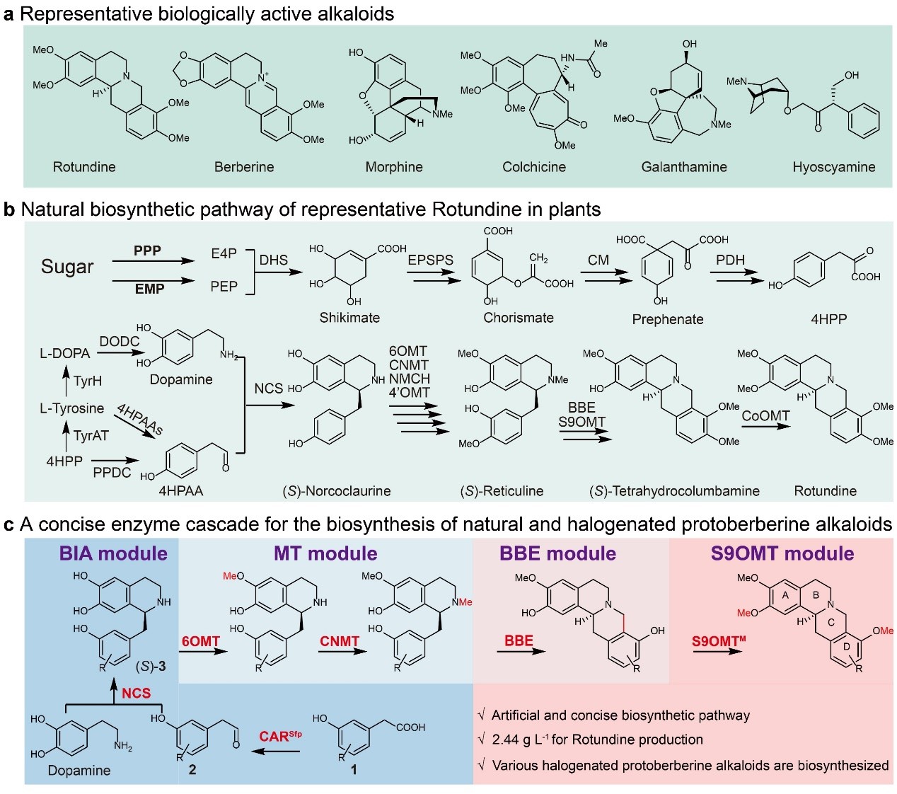 植物源生物碱是一类具有多种药理特性的关键天然产物。然而,由于其在药用植物中的含量较低且结构复杂性和多样性不足,限制了其广泛应用和发展。尽管化学合成和异源生物合成技术在一定程度上缓解了这些问题,但这些方法的产量仍不足以支持大规模工业化生产。为解决上述挑战,本研究通过途径设计简化原小檗碱类生物碱的合成步骤,构建了一个高效的酶级联反应系统,克服了原小檗碱类生物碱生物合成中关键酶表达量低、活性差的固有瓶颈,实现了中药延胡索主要活性成分天然镇痛药物罗通定的克级合成,为其工业化生产提供了新的策略和技术手段(图1),助力中药现代化。