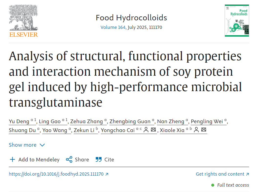 夏小乐教授团队在微生物来源谷氨酰胺转氨酶(MTG)的改造与应用研究中取得新进展,研究结果“Analysis of structural, functional properties and interaction mechanism of soy protein gel induced by high-performance microbial transglutaminase”正式发表于Food Hydrocolloids(一区TOP期刊,IF=11.0) (//doi.org/10.1016/j.foodhyd.2025.111170)。