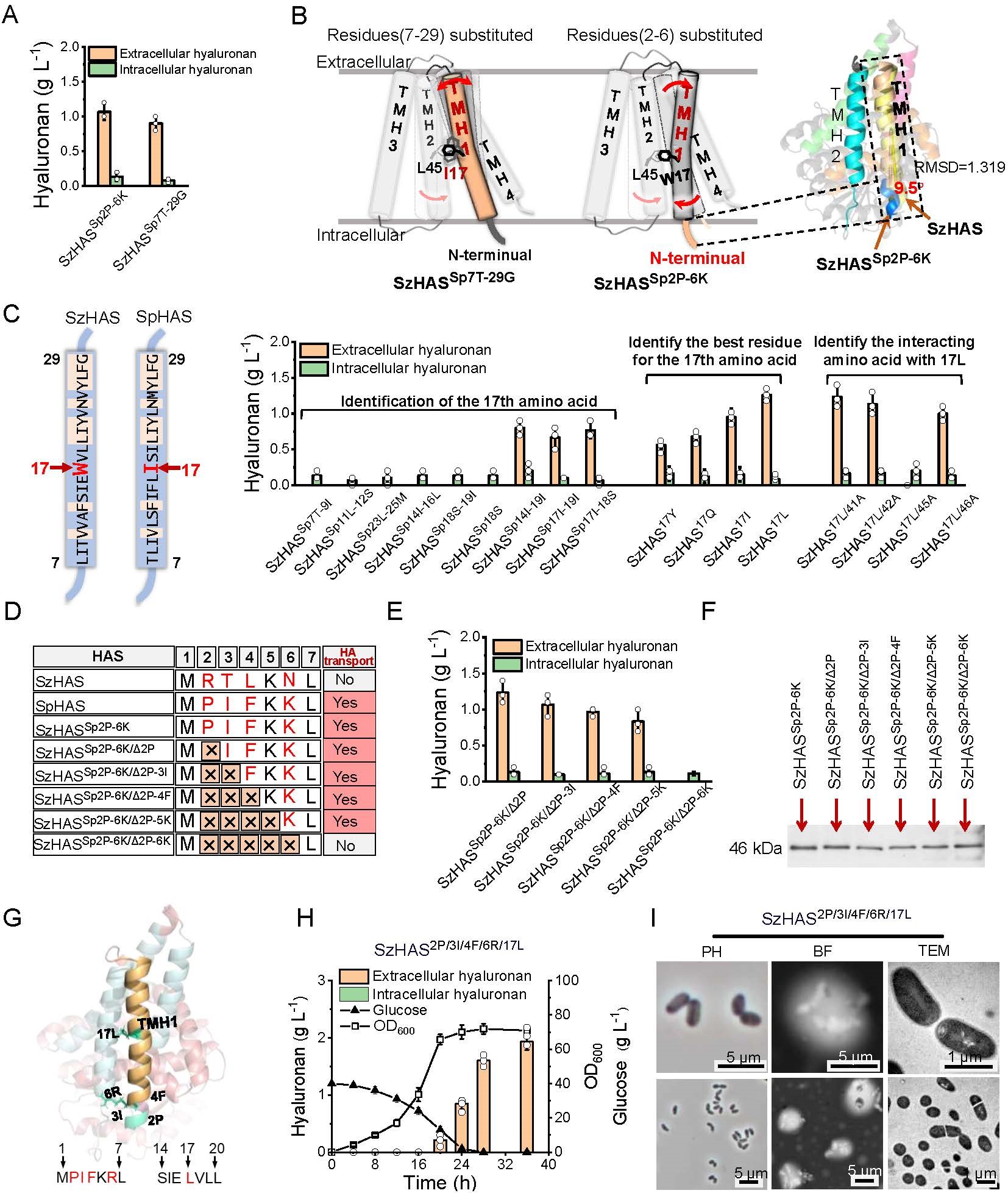 Ⅰ型HAS是一种多功能跨膜蛋白,其胞质结构域负责底物结合及HA聚合,跨膜通道调控HA链的延伸与转运。在谷氨酸棒状杆菌中外源引入兽疫链球菌来源HAS(SzHAS)后,发现SzHAS保留了HA聚合活性,但跨膜通道构象异常导致HA胞内积累,引发细胞形态畸变、膜损伤及生长代谢停滞。脂质组学分析表明,谷氨酸棒杆菌的磷脂酰肌醇(PI)含量显著低于兽疫链球菌。过表达PI合酶提升PI水平后,HA仍滞留胞内,但细胞生长部分恢复,形态及膜完整性显著改善。研究表明,SzHAS跨膜通道构象受膜脂质环境调控,其正确构象对HA生物合成和转运具有核心调控作用。