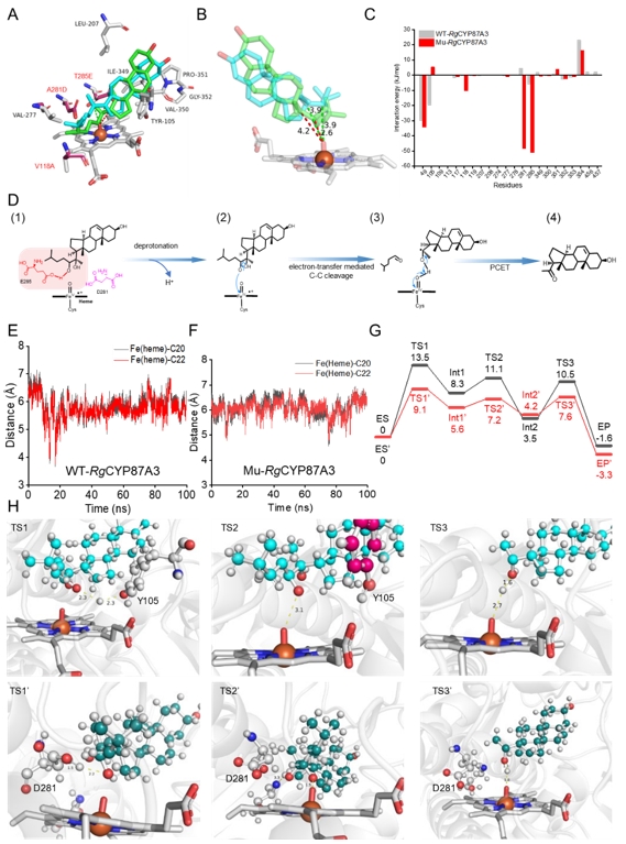 图4 分子动力学模拟和QM/MM解析CYP87A的电子传递工程机制