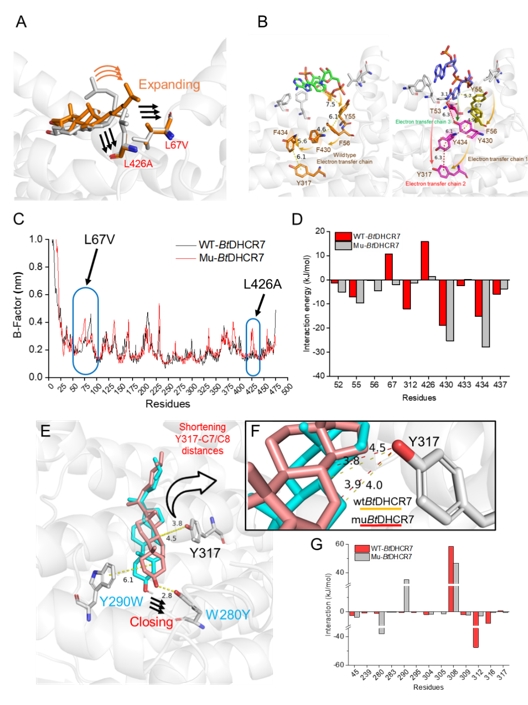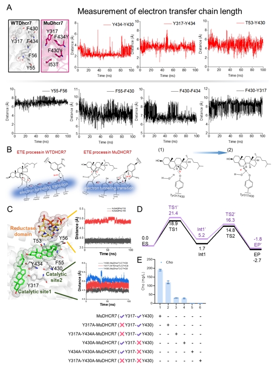 图3 分子动力学模拟和QMMM解析DHCR7电子传递工程机制