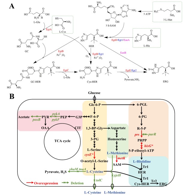 麦角硫因是一种具有强大抗氧化、细胞保护和免疫调节功能的天然活性物质,广泛应用于食品、化妆品和医药领域。然而,其天然产量低、化学合成污染大、生物合成效率低等问题长期制约其大规模应用。