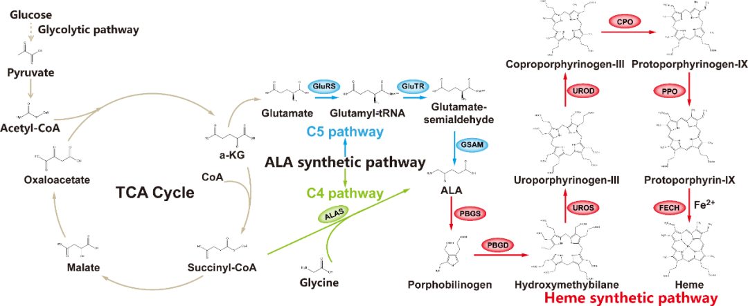 血红素是血红蛋白执行其生理功能所必需的辅基,要想高效合成血红蛋白首先需要提高胞内血红素的供给水平。在自然界中血红素的合成主要通过C4和C5两种途径(图2),通过强化C4途径并补加甘氨酸和琥珀酸作为底物或强化抗反馈抑制的C5途径都可以增加胞内血红素前体5-氨基酮戊酸(ALA)的含量。在此基础上继续强化并模块化改造血红素合成的下游途径,可在大肠杆菌中不添加底物的情况下实现115.5±2.3mg/L血红素的合成。此外,由于胞内过高含量的血红素会显著抑制菌体的生长,利用血红素转运蛋白可以实现超过60%血红素的分泌合成,以减轻血红素对细胞的毒性作用。