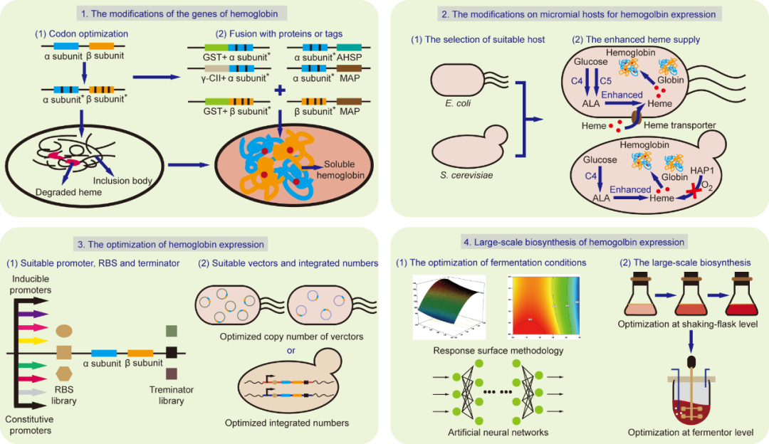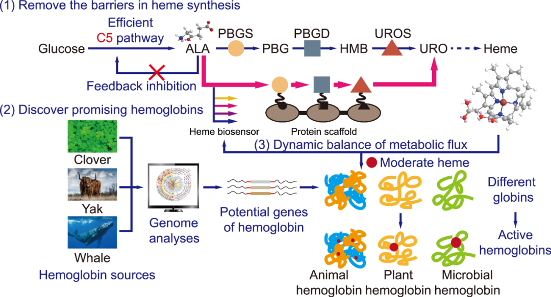 血红蛋白是一类存在于原核和真核细胞中的以血红素为辅基的含铁金属蛋白,在生物体内具有运输和储存氧、调节胞内pH值、调控生理代谢等诸多重要功能。近年来,血红蛋白已经被应用于急诊医学(作为无细胞氧载体)、医疗保健(作为铁补给剂)、食品加工(食品级着色和调味剂)等领域。但血红蛋白的获取依然需要依靠从血液或植物组织中提取,提取法不仅费时低效、并且所用化学试剂还易造成环境污染。因此,以微生物细胞工厂为平台来合成不同来源的血红蛋白已经成为近年来的研究热点。