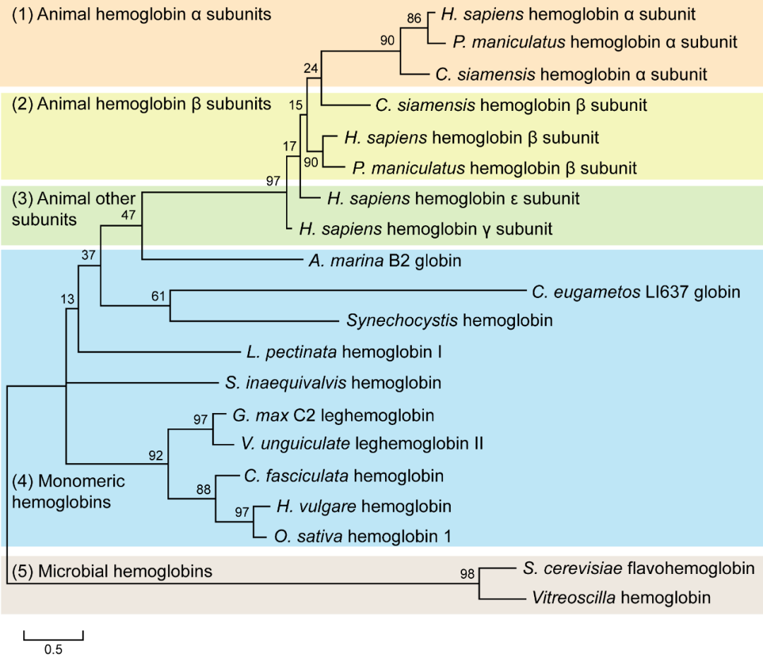 在NCBI的GeneBank数据库中已有超过141110条的血红蛋白基因编码序列,在EMBL蛋白数据库中已有超过84424条的血红蛋白氨基酸序列,在PDB蛋白晶体数据库中也已经有725条血红蛋白的三维结构数据,但现阶段其中只有15种不同来源(人、大豆、鳄鱼等)的血红蛋白可由9种有限的微生物(大肠杆菌、酿酒酵母、枯草芽孢杆菌等)合成。根据对现有血红蛋白氨基酸序列进行系统发育树分析,发现不同来源的血红蛋白及其亚基分为几类:动物来源血红蛋白α亚基、β亚基以及其他类型亚基,植物来源单亚基血红蛋白、微生物来源血红蛋白(图1)。因此,可以综合应用目前越来越成熟的代谢工程和合成生物学策略,开发出有效且稳定的血红蛋白微生物合成方法,来满足对人、大豆、透明颤菌等不同物种血红蛋白的大规模应用的需求。