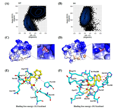图三 复合物WT−3a及M4−3a预反应状态统计分析及结合自由能分析