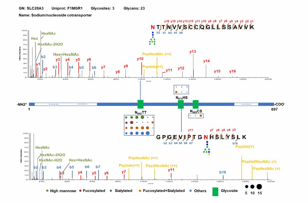 本项研究对分离的牛奶外泌体分两步进行研究,首先利用不同衍生化的方法将牛奶外泌体的N-糖、O-糖及乳清中的游离糖进行分析,共鉴定到151种糖链结构,并以此建立一个糖库用于糖蛋白组学匹配;随后利用实验室开发的一步法富集糖肽和位点特异性完整糖肽的分析技术,将牛奶外泌体的糖肽及非糖肽进行分离纯化;最后基于生物质谱及生物信息学的研究技术,对糖链及肽段进行检测和分析。实验结果显示牛奶外泌体中岩藻糖修饰和唾液酸修饰在丰度及多样性方面占主导地位,其次有三种N-糖仅存在于牛奶外泌体中,可以作为牛奶外泌体的潜在生物标志物;同时本项研究还首次发现了一些新型糖蛋白及糖基化修饰。本研究完整的鉴定了牛奶外泌体的糖组学及糖蛋白组学,为后续开展以牛奶外泌体为载体的靶向载药提高了良好的基础。