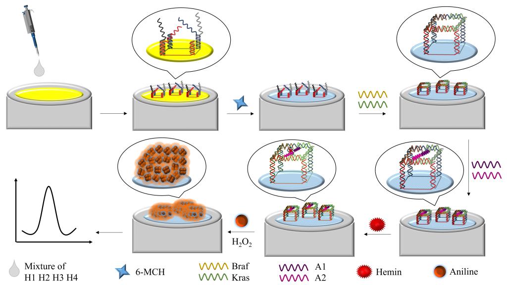 在世界卫生组织发布的《2020全球癌症报告》中显示,2020年全球新发癌症病例1929万例,引起了社会的广泛关注,而癌症的早期筛查和诊断是提高治愈率,降低致死率的关键手段。循环肿瘤DNA(ctDNA)是单链或双链由肿瘤细胞产生并释放至循环系统的DNA片段,可用作肿瘤诊断的生物标志物,但其在血清中的浓度极低不易被检出。Kras DNA和Braf DNA均为肿瘤相关DNA,其中任何一种发生碱基突变后,均有极大概率发生卵巢癌的风险。利用电化学技术所具有的高灵敏高、检测范围广等特点,结合DNA自组装纳米结构的多功能特性,构建针对多种ctDNA的生物传感器,在肿瘤的早期诊断中具有良好的应用前景。
