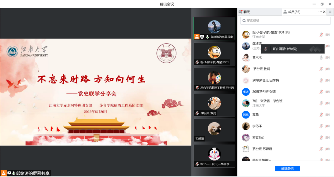 在“七一”来临之际,6月26日晚,UED体育 酿酒1901班“赤水河”特称团支部联合茅台学院酿酒工程系学生,开展“不忘来时路,方知向何生”党史联学分享会,7名同学“云端”进行学习分享,两校近百名酿酒学子线上参与活动。