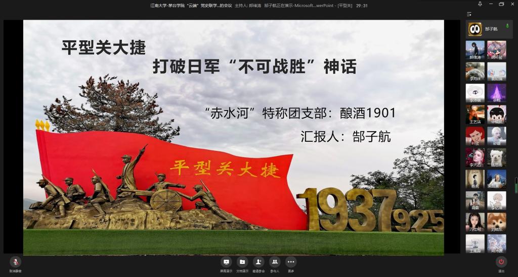 “赤水河”特称团支部联合茅台学院酿酒工程系学生开展了“学党史、悟思想、铭初心、共奋进”为主题的“云端”党史联学分享会。来自茅台学院酿酒系和UED体育