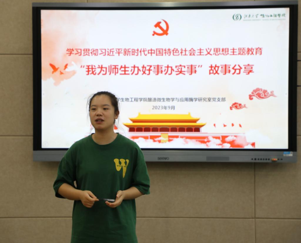支部党员围绕科研生活、志愿服务、团队文化建设等多方面进行故事分享。韩孟希同志分享了参与学院2023级迎新志愿工作以及担任实验室宣传助管的经验体会,她在迎新过程中引导新生了解学院历史,感受酿酒工艺,提升学科认同感,通过实验室宣传平台管理,展现实验室良好的发展势头;刘欢同志谈及在指导本科生参加学科竞赛时的经历,指导学弟学妹完成实验、撰写论文的同时也提升了自身的科研能力,实现教学相长;余杨青同志就组织实验室活动进行分享,从外出参访实践,到书画文化体验,再到毕业交流活动等等,一次次精心组织,凝聚起奋发向上的团队文化氛围,而她自身也在服务和奉献中实现了个人成长、增强了使命担当。