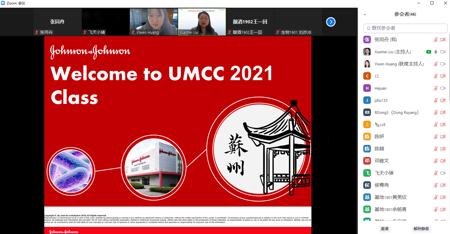 与强生(苏州)医疗器材有限公司2021年度校企合作课程(医疗器械和制药微生物学UMCC模块)开班并进行第一次授课。强生(苏州)公司微生物质量及无菌保证(MQSA)总监刘雪美、MQSA高级研究员黄奕雯、MQSA经理朱健杰、MQSA研究员董薷阳,UED体育