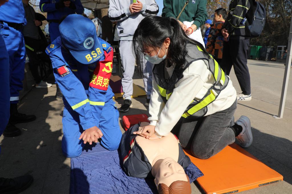 活动伊始,蓝天救援队党支部组织委员沈建杰向大家表达热烈的欢迎,并介绍了队伍基本情况。随后,老师和同学们换上救援队志愿者服装,参观惠山应急服务站,重点学习了心肺复苏术(CPR)。救援服务站站长张丽介绍道:“人的心脏骤停是一种高发、高危型的疾病,黄金抢救时间极其短暂”。紧接着,她借用人体模型进行了心脏复苏术的要领讲解与动作示范,师生轮番上阵,亲身体验了急救过程,在救援队成员的专业指导下,规范了自己的救援动作。
