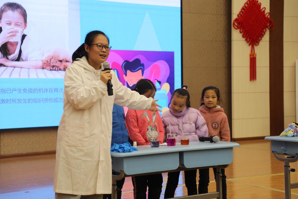 “大家知道树叶为什么会在秋天变黄吗?”志愿者以一个问题开始了本次授课。科普公益课的第一讲,选取了生活中的颜色变化这一现象为切入点,设置了黄色、蓝色、红色三个科普章节,三位大学生刘含章、余尚洋、付慧娴担任本次课程的教师,为小学生讲解每种颜色变化现象背后所蕴含的科学道理,并将疫苗接种的科学原理、蛋白质工程、基因组计划等前沿科学融入其中。科学原理讲解过后,负责实践环节的刘天宇同学为小学生们带来了科学实验,观察不同颜色的试剂在加入维生素C后溶液的变化。小学生们对于实验中溶液颜色的变化产生了浓厚的兴趣,激发了他们探索科学、探索世界的热情。