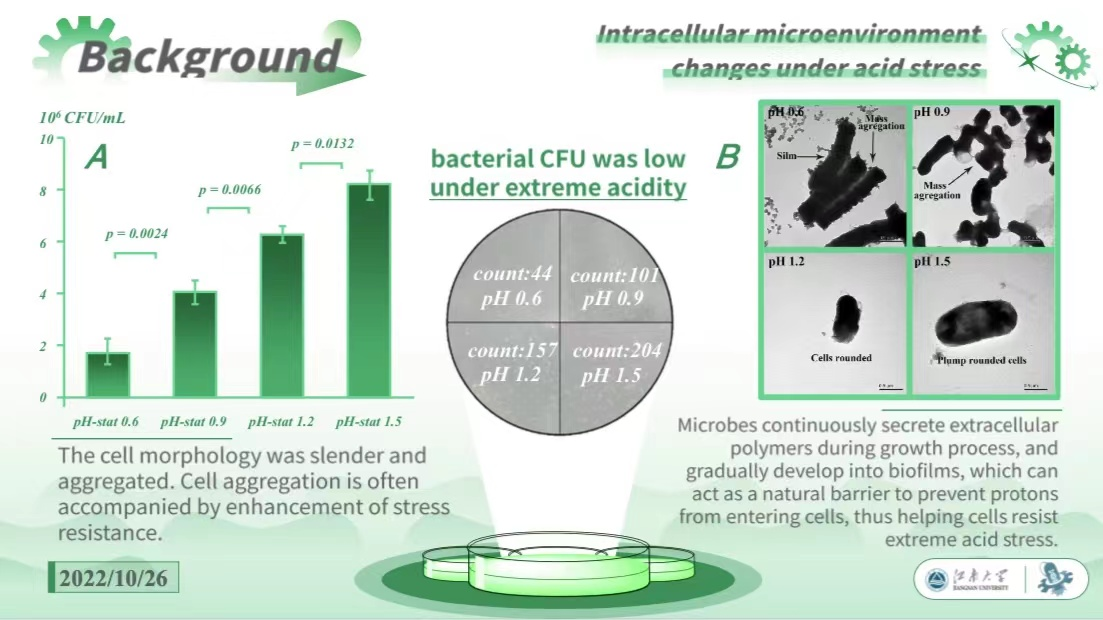 、化学与材料工程学院、生命科学与健康工程学院、设计学院、物联网工程学院的本科生共同组成。团队项目以极端嗜酸喜温硫杆菌(A. caldus)为研究对象,挖掘其天然优势的极端抗逆元件用于解决工业发酵过程中菌株的酸胁迫问题,致力于设计和创造一种更为耐酸的通用底盘微生物,以期为工业发酵生产提供一种更高效、更经济的解决方案,在社会实践和问卷调查中也获得了良好反响,具有较好的实用价值和社会意义。