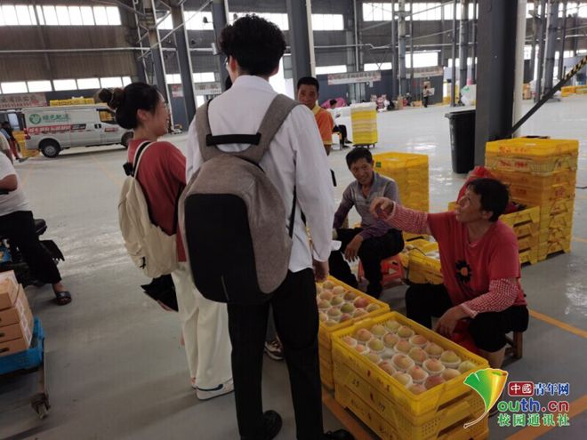 图为团队成员来到水蜜桃临时交易市场与农户交流学习。中国青年网通讯员 王云萱 供图