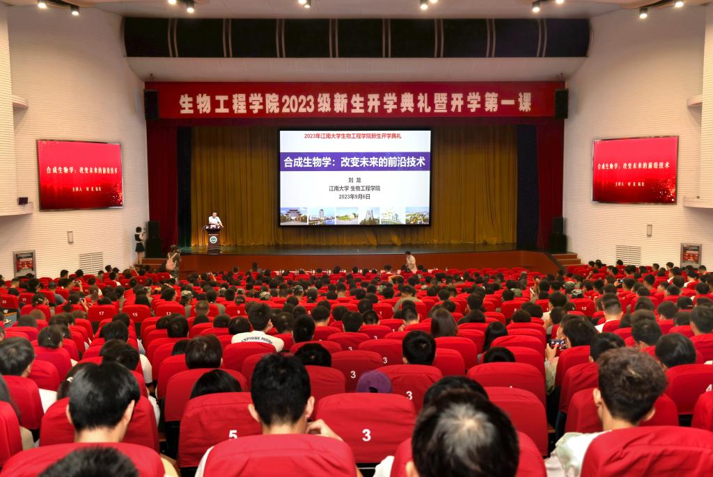 典礼结束后,刘龙院长以《合成生物学:改变未来的前沿技术》为题,为2023级新生讲授“开学第一课”。他带领同学们纵览学院历史沿革,介绍了学院学科建设、人才培养、专业建设、师资队伍、科研平台、对外交流等内容。在科技与产业革命、低碳经济发展的背景下,他以“为什么要发展生物制造”为引,论述合成生物学的理论框架、使能技术等。他指出,全球正处于一场新的生物技术和生物制造的工业革命,同学们要以大格局、大胸怀、大思路修炼大作为,让人生之路行稳致远、绚烂如花,在强国路上贡献自己的青春力量。聆听刘龙教授的授课,同学们受益颇深,前沿科学技术让同学们倍感振奋。