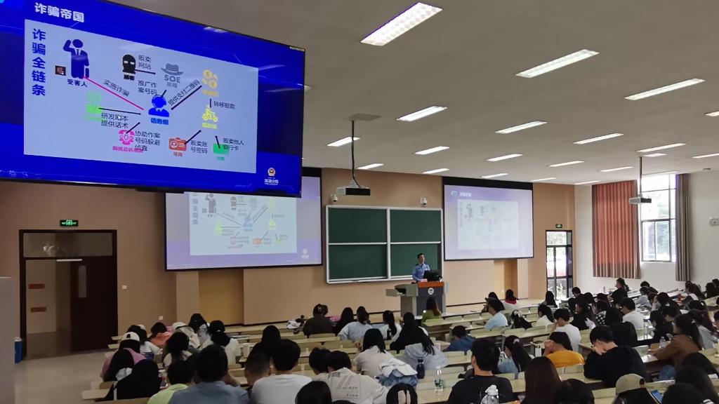 讲座现场,王俊皓通过数据向大家展现了当前防诈骗的形势,强调了针对在校大学生开展防诈骗教育的重要性。他通过详实的案例、生动的视频,分析了网络诈骗的基本特征,向同学们介绍了“网购刷单诈骗”“校园贷诈骗”“裸聊诈骗”等各种类型诈骗的常见作案方法,并提醒大家在日常生活中要提高警惕,切勿因贪图小利而落入诈骗分子的陷阱。讲座内容丰富、形式多样,现场气氛热烈。王警官通过PPT展示、案例分析等多种方式,让在场学生更好地了解诈骗犯罪的类型、特点和危害。同时王警官还提醒全体同学们,务必警钟长鸣,遵守法律法规,共同营造风清气正的社会环境。