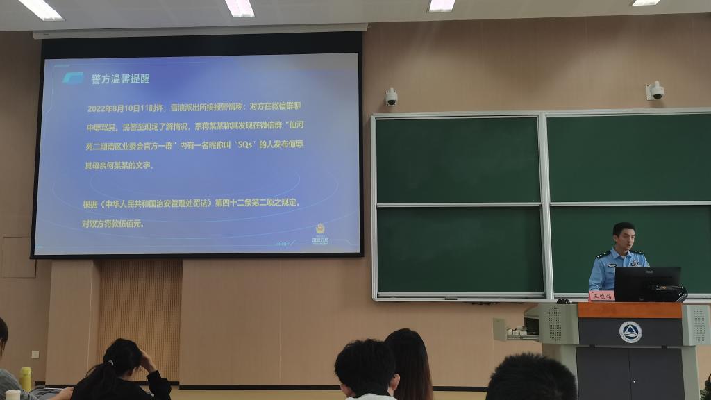 为宣传网络安全理念,切实提升学生防骗意识和能力,构筑和谐平安校园。10月14日下午,UED体育 在二教2A127举办研究生新生安全教育讲座。无锡市公安局滨湖分局雪浪派出所王俊皓警官带来了《防范诈骗专题讲座之走进高校》主题报告。学院辅导员张同舟和2023级研究生新生参加活动。