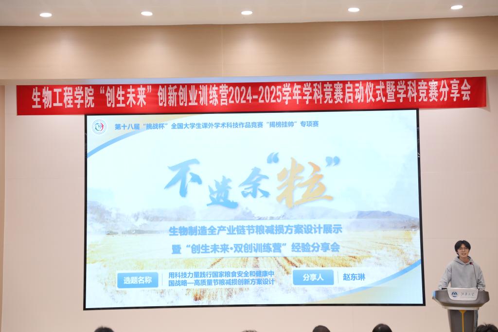 接着,全国生命科学竞赛、国家级大学生创新创业训练项目、中国国际大学生创新大赛以及挑战杯揭榜挂帅赛项目负责人分别作学科竞赛经验分享。作为第九届全国生命科学竞赛国赛二等奖获得者代表,陈萌轩从时间管理、实验技能、材料撰写、困难应对、心态调节等五方面详细分享了在参与生命科学竞赛过程中的感悟体会,为参与2025年第十届全国生命科学竞赛的学弟学妹们提供宝贵的实战经验。作为国家级大学生创新创业训练项目的团队代表,张耀增带来《基于乳酸菌开发的创新型健康饮品》项目报告分享,从项目背景、行业痛点、技术理念、技术难点、商业分析等角度全面展示国家级大创项目研究内容,为新一学年参与大创项目的学生提供创新性典范展示。作为第十八届“挑战杯”全国大学生课外学术科技作品竞赛“揭榜挂帅”专项赛特等奖获奖代表,赵东琳结合自身竞赛经历,从队伍创建、项目准备以及答辩展示等方面,为即将参与竞赛的同学们进行详细剖析,提供经验案例指导。作为2024年中国国际大学生创新大赛金奖获奖代表,常泽鹏进行项目展示《芯想食成—首创中国食品检测“活肠道”》,该项目将人体活性肠道组织以器官芯片形式与仿生反应器结合,为个性化营养方案制定、疾病预防与干预等提供更加精准的科学依据。此外,他还从挖掘竞赛创新点、理顺逻辑思路、分析实验数据等环节分享了备赛心得体会。