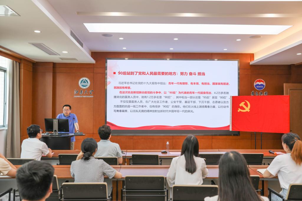于茅台厅举行新党员“七一”入党宣誓仪式暨专题党课。学院党委书记王维、院长许正宏、党委副书记兼副院长周云龙、党委秘书王玉红、分团委全体老师以及54名新入党的预备党员参加了本次活动。仪式由周云龙同志主持。由于疫情影响,本次活动采用线上线下相结合的方式开展,未返校的党员通过企业微信进行了宣誓和学习。