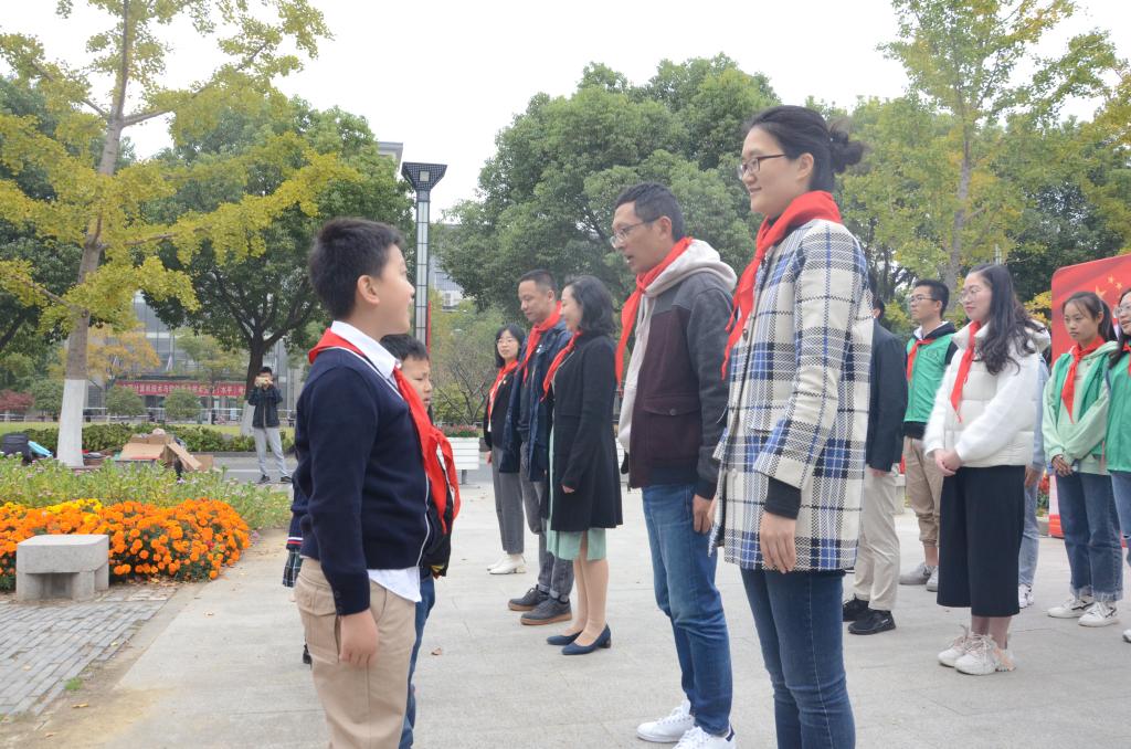 7点30许,伴随着《中国少年先锋队队歌》活动正式开始,五位小朋友给家长们敬献红领巾。随后,在国旗班同学带领下,小朋友们组成护旗方阵,迈着整齐的步伐来到升旗台。在激昂的国歌声中,小学生升旗手与国旗班大学生升旗手共同将五星红旗升至旗杆顶端,鲜艳的五星红旗迎风飘扬。