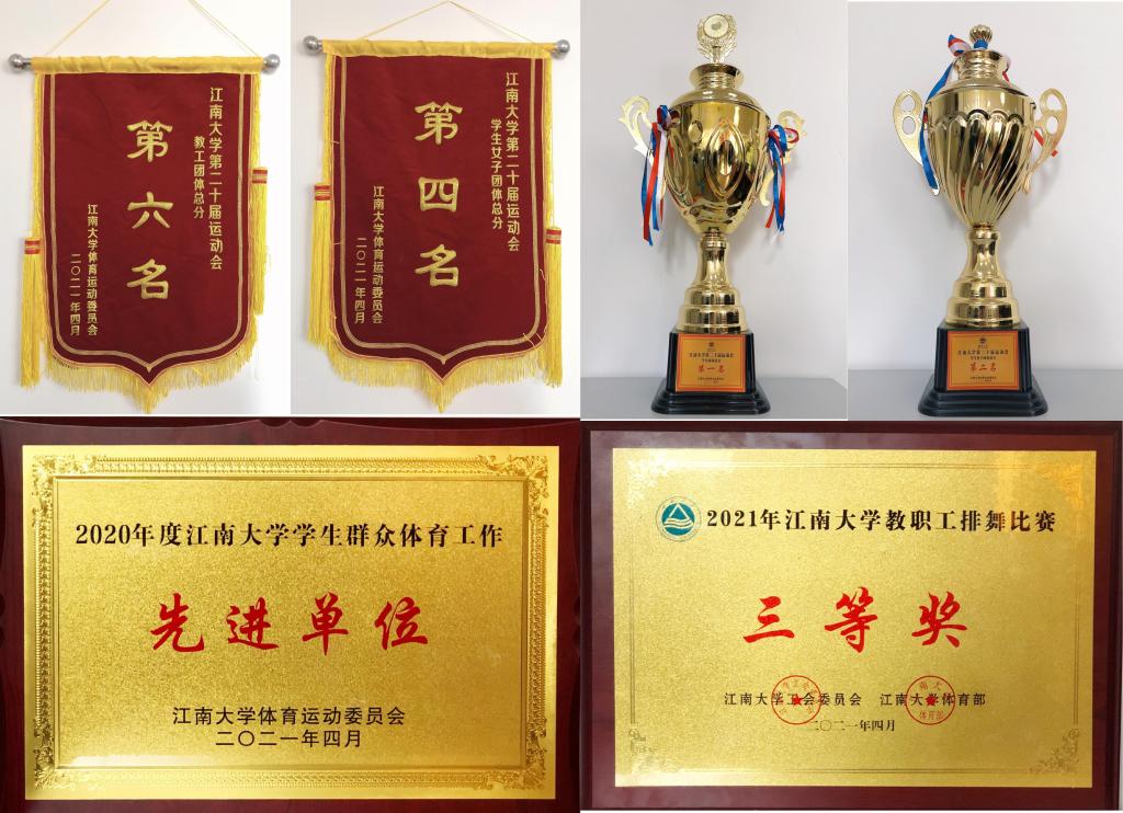荣获江南大学2020年度“何振梁杯”及“江南大学2020年度学生群众体育工作先进单位”称号;宋大有老师和杨子仪同学获“江南大学2020年度学生群众体育工作先进个人”称号。