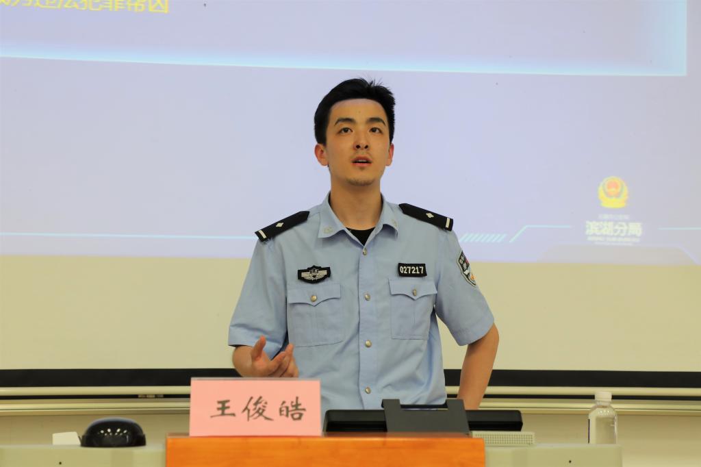 首先,王俊皓警官通过具体的数据,向大家展现了当前防诈骗的形势,强调了针对在校大学生开展防诈骗教育的重要性。随后,他还通过详实的案例、生动的视频,分析了网络诈骗的基本特征,向同学们介绍了“网购刷单诈骗”、“校园贷诈骗”等各种类型诈骗的常见作案方法。他提出,大学生社会经验不足,阅历不深,需要更加提高反诈意识,不要贪图小便宜,守好自己的“钱袋子”。