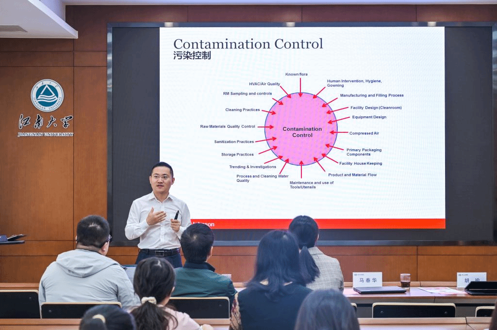开班仪式上,陈献忠首先表示了对强生(苏州)大力支持校企合作课程的感谢,同时介绍了医疗器械与制药微生物学UMCC课程的设立基于一流学科建设背景。他强调,一流人才培养需要和优势企业深度合作,希望同学们抓住机会,注重课程体验,充分发挥校企合作效能。随后,刘雪美为同学们详细讲解了课程建设和师资队伍情况。她指出,本次课程以健康医药工业领域的需求为基础,包含企业讲师授课、工厂参观和考核等。马春华围绕“Contamination Control”主题开讲第一课,他从人员、环境、设备、原料等方面切入,并结合实际工业案例,向同学们介绍工业领域污染防控知识。