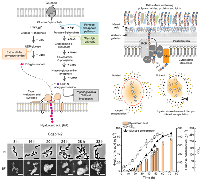 在该论文中,研究人员以食品级宿主谷氨酸棒杆菌为出发菌株,在构建了透明质酸合成途径基础上对关键前体中间代谢途径进行了系统分析与调控优化;在此基础上,对谷氨酸棒杆菌胞外杂多糖合成系统进行了鉴定分析,通过敲除糖基转移酶,弱化了胞外甘露聚糖和阿拉伯甘露聚糖相关多糖合成,有效促进了透明质酸合成;此外,研究人员首次发现分泌到细胞外的透明质酸将细胞包裹起来,形成了“胶囊团”,“胶囊团”限制了菌体代谢,改变了细胞形态,阻断了透明质酸的合成;基于此,研究人员开发了基于定量调控水蛭透明质酸酶消除透明质酸“荚膜层”的发酵策略。最终,低分子量透明酸(分子量为5.3万道尔顿)发酵水平为74.1g L-1,为国际报道最高水平。