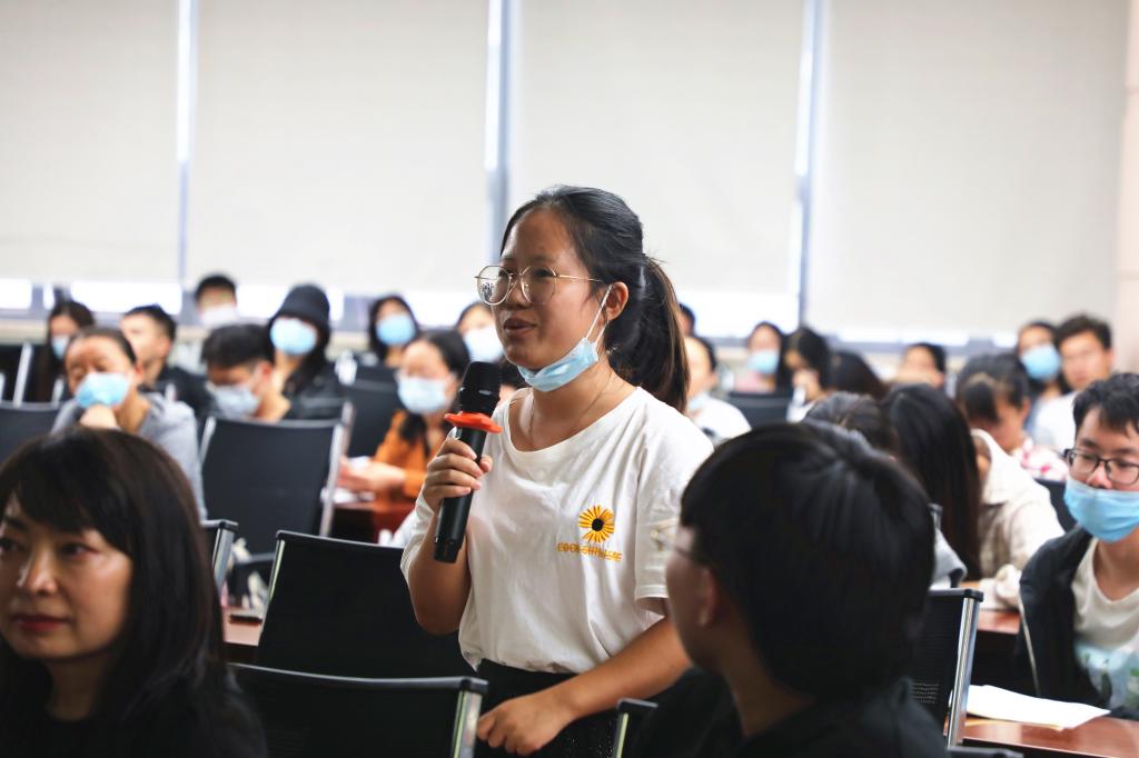 李垚教授对江南大学取得的科研成就和优美的校园环境给予了高度的赞赏和肯定,以“百年未有之大变局”的疫情和国际形势为导语展开了“上下求索”“慧眼洞见”“开启未来”三个篇章的讲述。第一篇章,李教授通过分享自己所创作的诗句,介绍了自己所在的团队以及仿生材料相关课题,生动展示了科研工作者的家国情怀。第二篇章,李教授着重阐述了科研创新与艺术修养结合的重要性,它是激发想象力的重要手段。第三篇章,李教授以“科技是把双刃剑”为主题强调了科研工作者应保持初心与热爱,并以自然界中的“共生效应”为例强调要加强合作交流。讲座结束后,现场同学踊跃提问,李教授以自身的经历与感悟为同学们一一解答并鼓励学子进入研究生学习已是跨越了不小的山峰,未来再多的坎坷也不足为惧,现场气氛活跃,热情高涨。